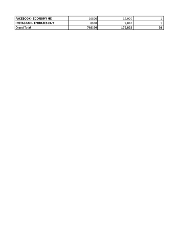 FACEBOOK - ECONOMY ME 10800 12,000 1 INSTAGRAM - EMIRATES 24/7 8600 9,000 1 Grand Total 716100 175,802 34