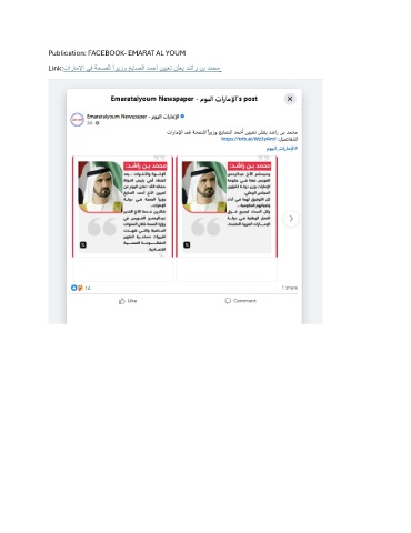Publication: FACEBOOK- EMARAT AL YOUM Link: تارﺎﻣﻹا ﻲﻓ ﺔﺣﺻﻠﻟ ًارﯾزو ﻎﯾﺎﺻﻟا دﻣﺣأ نﯾﯾﻌﺗ نﻠﻌﯾ دﺷار نﺑ دﻣﺣﻣ