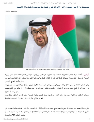 9/2/25, 4:40 PM                    سرﺑ ﺔﻣﻷا ﺔﻛﺑﺷ | ﺔﺣﺻﻟا ةرازو لﻣﺷﯾ اًدودﺣﻣ ﺎﯾﻣوﻛﺣ  ً ﻼﯾدﻌﺗ يرﺟُﺗ تارﺎﻣﻹا : دﯾاز نﺑ دﻣﺣﻣ سﯾﺋرﻟا نﻣ تﺎﮭﯾﺟوﺗﺑ
