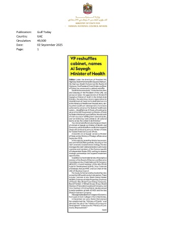 Publication: Gulf Today Country: UAE Circulation: 49,500 Date: 02 September 2025 Page: 1