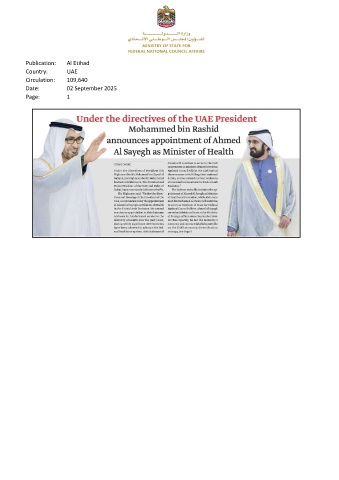 Publication: Al Etihad Country: UAE Circulation: 109,640 Date: 02 September 2025 Page: 1