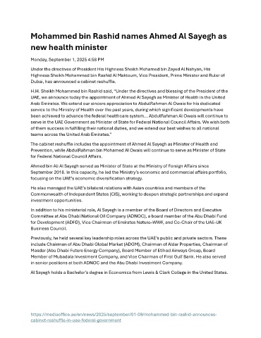 The cabinet reshuffle includes the appointment of Ahmed Al Sayegh as Minister of Health and
