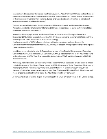 The cabinet reshuffle includes the appointment of Ahmed Al Sayegh as Minister of Health and
