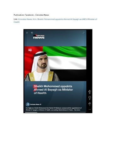 Publication: Facebook – Emirates News Link: Emirates News: H.H. Sheikh Mohammed appoints Ahmed Al Sayegh as UAE's Minister of Health