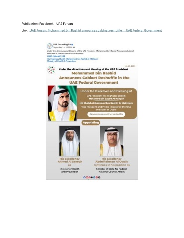 Publication: Facebook – UAE Forsan Link: UAE Forsan: Mohammed bin Rashid announces cabinet reshuffle in UAE Federal Government