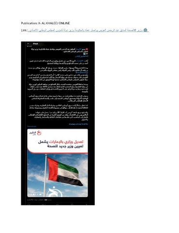 Publication: X- AL KHALEEJ ONLINE Link: ..يدﺎﺣﺗﻻا ﻲﻧطوﻟا سﻠﺟﻣﻟا نوؤﺷﻟ ﺔﻟود رﯾزو ﺔﻣوﻛﺣﻟﺎﺑ ﮫﻠﻣﻋ لﺻاوﯾ سﯾوﻌﻟا نﻣﺣرﻟا دﺑﻋ ﻖﺑﺎﺳﻟا ﺔﺣﺻﻟا# رﯾزو