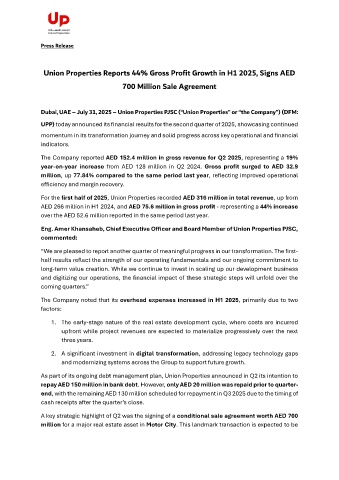 Dubai, UAE – July 31, 2025 – Union Properties PJSC (“Union Properties” or “the Company”) (DFM:
