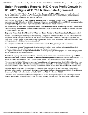 8/1/25, 9:32 AM Union Properties Reports 44% Gross Profit Growth In H1 2025, Signs AED 700 Million Sale Agreement | Dubai Property Guide