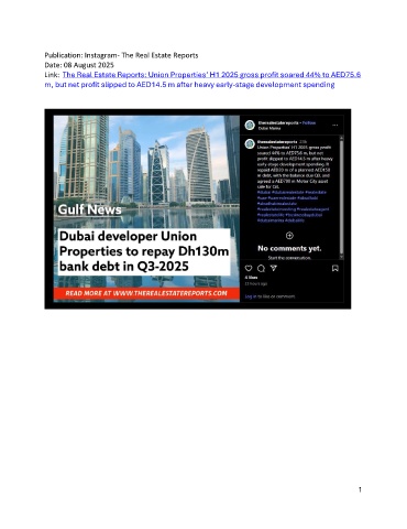 Publication: Instagram- The Real Estate Reports Date: 08 August 2025 Link: The Real Estate Reports: Union Properties’ H1 2025 gross profit soared 44% to AED75.6 m, but net profit slipped to AED14.5 m after heavy early-stage development spending 1