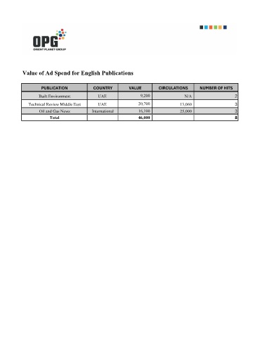Value of Ad Spend for English Publications PUBLICATION COUNTRY VALUE CIRCULATIONS NUMBER OF HITS Built Environment UAE 9,200 N/A 2 Technical Review Middle East UAE 20,700 13,060 3 Oil and Gas News International 16,100 25,000 3 Total 46,000 8