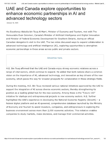 10/17/25, 9:35 AM UAE and Canada explore opportunities to enhance economic partnerships in AI and advanced technology sectors - Middle East B…