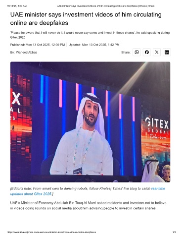 10/14/25, 8:53 AM UAE minister says investment videos of him circulating online are deepfakes | Khaleej Times