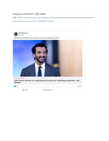 Publication: FACEBOOK – GULF NEWS Link: https://www.facebook.com/GulfNews.UAE/posts/uae-minister-declares-ai-as-essential-to- national-sovereignty-at-gitex/1249482257210151/