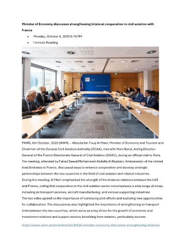 PARIS, 6th October, 2025 (WAM) -- Abdulla bin Touq Al Marri, Minister of Economy and Tourism and