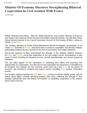 10/7/25, 4:05 PM Minister Of Economy Discusses Strengthening Bilateral Cooperation In Civil Aviation With France | Pakistan Point