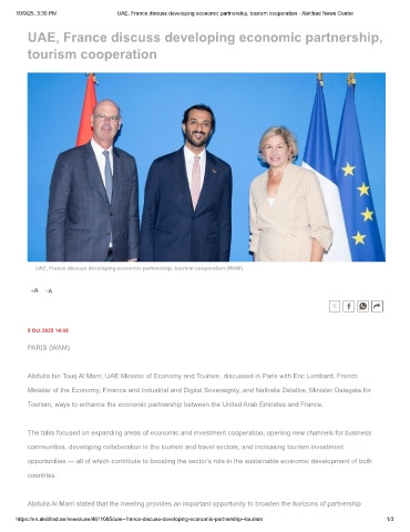 10/9/25, 3:30 PM UAE, France discuss developing economic partnership, tourism cooperation - Aletihad News Center