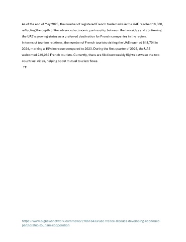 In terms of tourism relations, the number of French tourists visiting the UAE reached 648,704 in