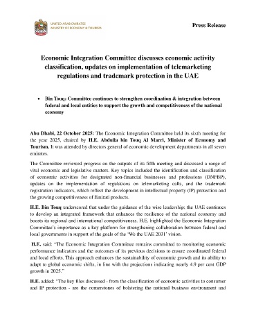Abu Dhabi, 22 October 2025: The Economic Integration Committee held its sixth meeting for