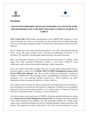 UAE, 14 May 2025: B2B broadcast and technology event CABSAT 2025 continues to set the