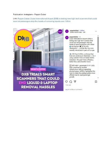 Publication: Instagram – Poppin Dubai Link: Poppin Dubai: Dubai International Airport (DXB) is testing new high-tech scanners that could soon let passengers skip the hassle of removing liquids over 100ml