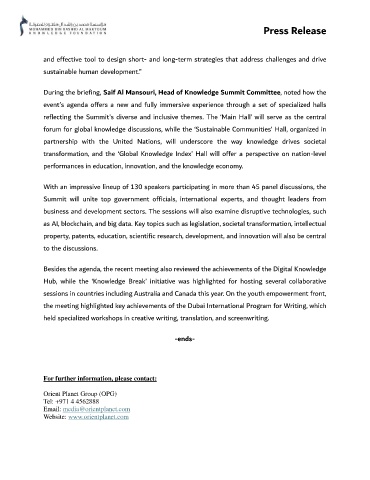 During the briefing, Saif Al Mansouri, Head of Knowledge Summit Committee, noted how the