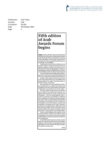 Publication: Gulf Today Country: UAE Circulation: 49,500 Date: 09 October 2025 Page: 2