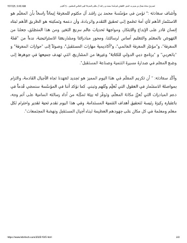 ماﺰﺘﻟاو ،ﺔﻣدﺎﻘﻟا لﺎﻴﺟألا هﺎﺠﺗ ﺎﻧﺪﻬﻌﻟ ﺪﻳﺪﺠﺗ ﻮﻫ ﺰﻴﻤﻤﻟا مﻮﻴﻟا اﺬﻫ ﻲﻓ ﻢّﻠﻌﻤﻟا ﻢﻳﺮﻜﺗ نأ " :ﻪﺗدﺎﻌﺳ ﺪﱠﻛأو