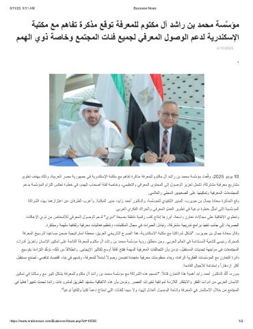 رﯾوطﺗ فدﮭﺑ كﻟذو ،ﺔﯾﺑرﻌﻟا رﺻﻣ ﺔﯾروﮭﻣﺟ ﻲﻓ ﺔﯾردﻧﻛﺳﻹا ﺔﺑﺗﻛﻣ ﻊﻣ مھﺎﻔﺗ ةرﻛذﻣ ﺔﻓرﻌﻣﻠﻟ موﺗﻛﻣ لآ دﺷار نﺑ دﻣﺣﻣ ﺔﺳﱠﺳؤﻣ تﻌ ﱠ ﻗو -2025 وﯾﻧوﯾ 10