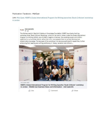 Publication: Facebook – Mid East Link: Mid-East: MBRF’s Dubai International Program for Writing launches ‘Book Criticism’ workshop in Jordan