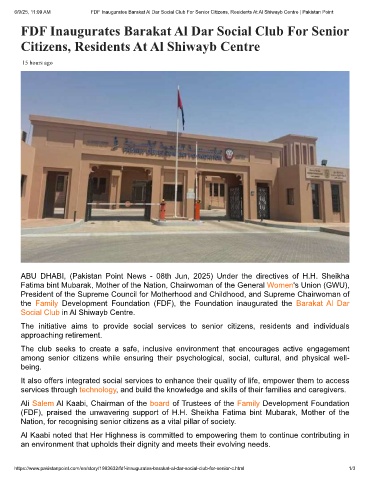 6/9/25, 11:09 AM FDF Inaugurates Barakat Al Dar Social Club For Senior Citizens, Residents At Al Shiwayb Centre | Pakistan Point