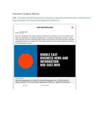 Publication: Facebook- Mid East Link: - Mid East: Red Hat Recognized as a Leader for Second Consecutive Year in 2025 Gartner® Magic Quadrant™ for Cloud-Native Application Platforms