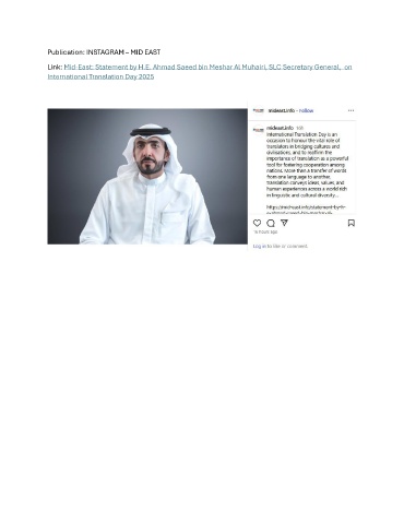 Publication: INSTAGRAM – MID EAST Link: Mid-East: Statement by H.E. Ahmad Saeed bin Meshar Al Muhairi, SLC Secretary General, on International Translation Day 2025