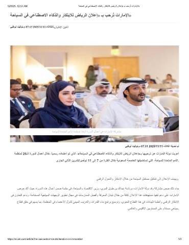 ﺔﻣظﻧﻣﻟ 26ـﻟا ةرودﻟا لﺎﻣﻋأ لﻼﺧ ،ًﺎﯾﻣﺳر هدﺎﻣﺗﻋا مﺗ يذﻟا ،«ﺔﺣﺎﯾﺳﻟا ﻲﻓ ﻲﻋﺎﻧطﺻﻻا ءﺎﻛذﻟاو رﺎﻛﺗﺑﻼﻟ ضﺎﯾرﻟا نﻼﻋإ»ـﺑ ﺎﮭﺑﯾﺣرﺗ نﻋ تارﺎﻣﻹا ﺔﻟود تﺑرﻋأ