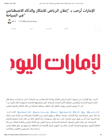 12/8/25, 12:57 AM موﯾﻟا تارﺎﻣﻹا رﺎﺑﺧأ | "ﺔﺣﺎﯾﺳﻟا ﻲﻓ ﻲﻋﺎﻧطﺻﻻا ءﺎﻛذﻟاو رﺎﻛﺗﺑﻼﻟ ضﺎﯾرﻟا نﻼﻋإ" ـﺑ بﺣرُﺗ تارﺎﻣﻹا