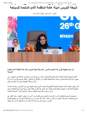 12/5/25, 7:45 AM 25 – ﺔﺣﺎﯾﺳﻠﻟ ةدﺣﺗﻣﻟا مﻣﻷا ﺔﻣظﻧﻣﻟ ﺔﻣﺎﻋ ﺔﻧﯾﻣأ سﯾوﻧﻟا ﺔﺧﯾﺷ ﺔﯾﺗارﺎﻣﻹا ..ﻲﻣﻣﻷا بﺻﻧﻣﻟا اذھ ﻰﻟوﺗﺗ ﺔﯾﺟﯾﻠﺧ ةدﯾﺳ لوأH