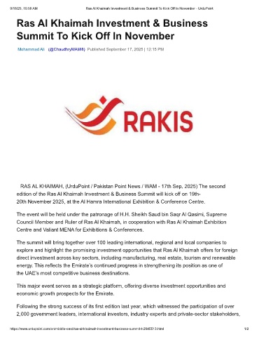 9/18/25, 10:58 AM Ras Al Khaimah Investment & Business Summit To Kick Off In November - UrduPoint
