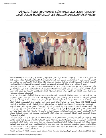 ﻲﻓ ﺎﮫﺗدﺎﻳر ةزﺰﻌﻣ (ISO 42001) وﺰﻳﻵا ةدﺎﮫﺷ ﻰﻠﻋ ﻞﺼﺤﺗ "ﻚﻧﻮﻔﯿﻧﻮﻳ"