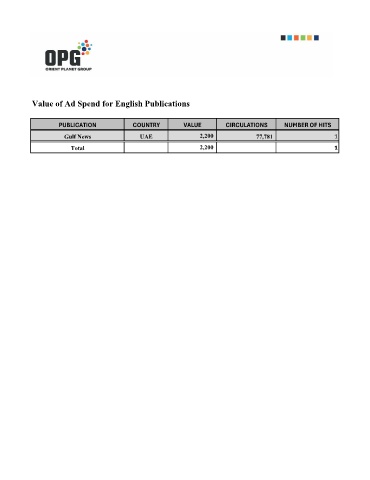 Value of Ad Spend for English Publications PUBLICATION COUNTRY VALUE CIRCULATIONS NUMBER OF HITS Gulf News UAE 2,200 77,781 1 Total 2,200 1