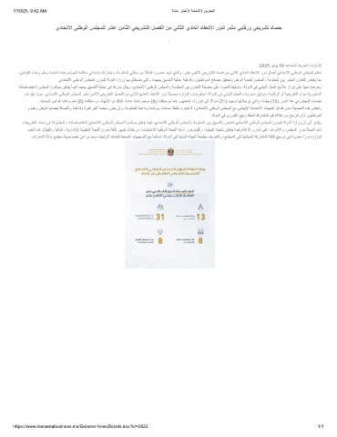 ددﻋ ﻎﻠﺑ ثﯾﺣ .يدﺎﺣﺗﻻا ﻲﻧطوﻟا سﻠﺟﻣﻠﻟ رﺷﻋ نﻣﺎﺛﻟا ﻲﻌﯾرﺷﺗﻟا لﺻﻔﻟا نﻣ ﻲﻧﺎﺛﻟا يدﺎﻌﻟا دﺎﻘﻌﻧﻻا رود ﺔﻠﯾﺻﺣ ةرازوﻟا تﺿرﻌﺗﺳا ؛ﺔﻟودﻟا ﻲﻓ ﻲﺑﺎﯾﻧﻟا لﻣﻌﻟا تﺎﺟرﺧﻣ ﻖﯾﺛوﺗو ،ﺔﯾﺑﺎﻗرﻟا وأ ﺔﯾﻌﯾرﺷﺗﻟا ءاوﺳ ﺔﯾروﺗﺳدﻟا