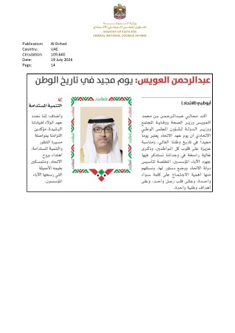 Publication: Al Etihad Country: UAE Circulation: 109,640 Date: 19 July 2024 Page: 14