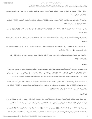 «ﻲﻣﻼﺳﻹا ﺔﻗرﺎﺷﻟا» عﺎﻔﺗرا لﺑﺎﻘﻣ %0.74 «ﻲﻧطوﻟا ﺔﻣﯾﺧﻟا سأر كﻧﺑ»و %0.1 «ﺔﺿﺑﺎﻘﻟا ﺔﯾﻣﻟﺎﻌﻟا»و %0.2 «يرﺎﺟﺗﻟا ﻲﺑظوﺑأ» ﻊﺟارﺗ ،ﺔﯾﻟﺎﻣﻟا عﺎطﻗ ﻲﻓو
