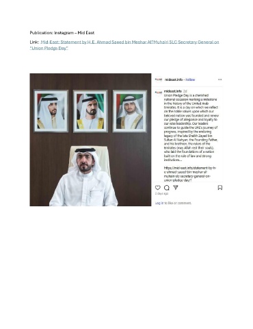Publication: Instagram – Mid East Link: Mid-East: Statement by H.E. Ahmad Saeed bin Meshar Al?Muhairi SLC Secretary General on “Union Pledge Day”