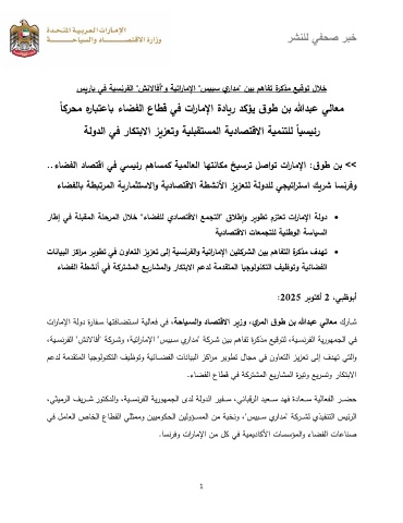 ..ءﺎضﻔﻟا دﺎصتﻗا ﻲﻓ ﻲس�ﺌر مﻫﺎسم� ﺔ�مﻟﺎﻌﻟا ﺎﻬتﻨﺎكﻤ ﺦ�ﺴرﺘ ﻞﺼاوﺘ تارﺎﻤﻹا :قوط نﺒ <<