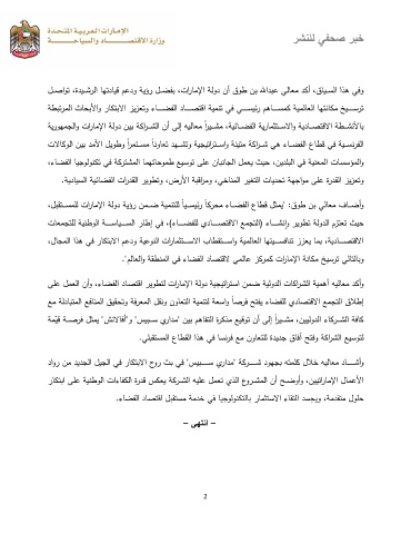 ﻰﻠﻋ لﻤﻌﻟا نأو ،ءﺎـﻀﻔﻟا دﺎـﺼﺘﻗا رﯿوطﺘﻟ تارﺎﻤﻹا ﺔﻟود ﺔﯿﺠﯿﺘارﺘـﺴا نﻤـﻀ ﺔﯿﻟودﻟا تﺎﻛارـﺸﻟا ﺔﯿﻤﻫأ ﻪﯿﻟﺎﻌﻤ دﻛأو