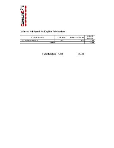 Value of Ad Spend for English Publications VALUE PUBLICATION COUNTRY CIRCULATIONS In AED Gulf Business Magazine GCC N/A 13,500 TOTAL 13,500 Total English - AED 13,500