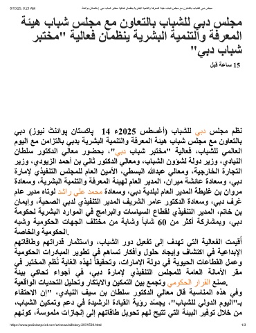 ﻲﺑد (زﻮﯿﻧ ﭧﻨﺋاﻮﭘ نﺎﺘﺴﮐﺎﭘ 14 ء2025 ﺲﻄﺴﻏأ) بﺎﺒﺸﻠﻟ ﻲﺑد ﺲﻠﺠﻣ ﻢﻈﻧ