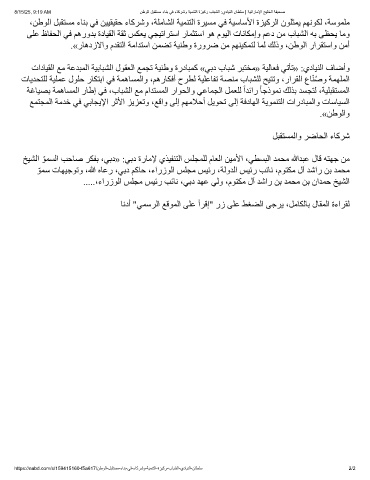 8/15/25, 9:19 AM نطوﻟا لﺑﻘﺗﺳﻣ ءﺎﻧﺑ ﻲﻓ ءﺎﻛرﺷو ﺔﯾﻣﻧﺗﻟا ةزﯾﻛر بﺎﺑﺷﻟا :يدﺎﯾﻧﻟا نﺎطﻠﺳ | ﺔﯾﺗارﺎﻣﻹا ﺞﯾﻠﺧﻟا ﺔﻔﯾﺣﺻ