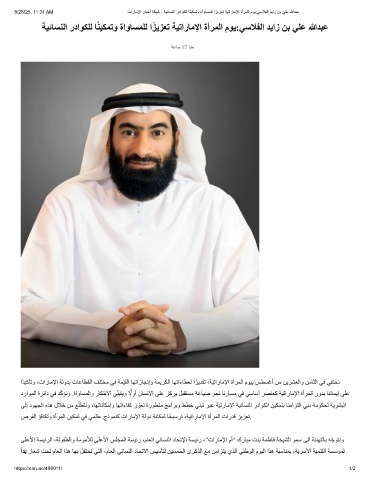 8/28/25, 11:31 AM تارﺎﻣﻹا رﺎﺑﺧأ ﺔﻛﺑﺷ - ﺔﯾﺋﺎﺳﻧﻟا رداوﻛﻠﻟ ﺎًﻧﯾﻛﻣﺗو ةاوﺎﺳﻣﻠﻟ ا ً زﯾزﻌﺗ ﺔﯾﺗارﺎﻣﻹا ةأرﻣﻟا موﯾ:ﻲﺳﻼﻔﻟا دﯾاز نﺑ ﻲﻠﻋ ﷲدﺑﻋ