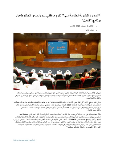 علطتنو ،راكتبلااو ملعتلاب فغشو مازتلا نم مكاحلا ومس ناويد وفظوم هرهظأ امب ،يبد ةموكحل ةيرشبلا دراوملا ةرئاد يف ،رخفنو ،يبد