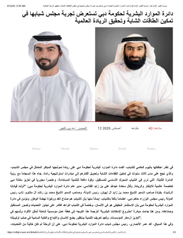 8/12/25, 9:36 AM ﺔﯾﻣﻟﺎﻌﻟا ةدﺎﯾرﻟا ﻖﯾﻘﺣﺗو ﺔﺑﺎﺷﻟا تﺎﻗﺎطﻟا نﯾﻛﻣﺗ ﻲﻓ ﺎﮭﺑﺎﺑﺷ سﻠﺟﻣ ﺔﺑرﺟﺗ ضرﻌﺗﺳﺗ ﻲﺑد ﺔﻣوﻛﺣﻟ ﺔﯾرﺷﺑﻟا دراوﻣﻟا ةرﺋاد | ﮫﯾﺗارﺎﻣﻹا رﺟﻔﻟا ةدﯾرﺟ | ﮫﯾﺗارﺎﻣﻹا رﺟﻔﻟا ةدﯾرﺟ